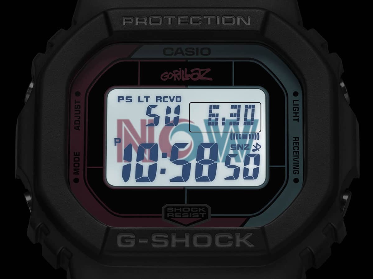 Каждая модель берет произведение искусства, связанное с Gorillaz, и перевоплощает его в дизайн и цветовую гамму часов. DW-5600 вдохновлен самым последним релизом группы The Now Now и отличается яркими синими и розовыми тонами. Когда используется подсветка, слово «СЕЙЧАС» всплывает на дисплее, что, по общему признанию, довольно бесполезно, но, несомненно, весело.
