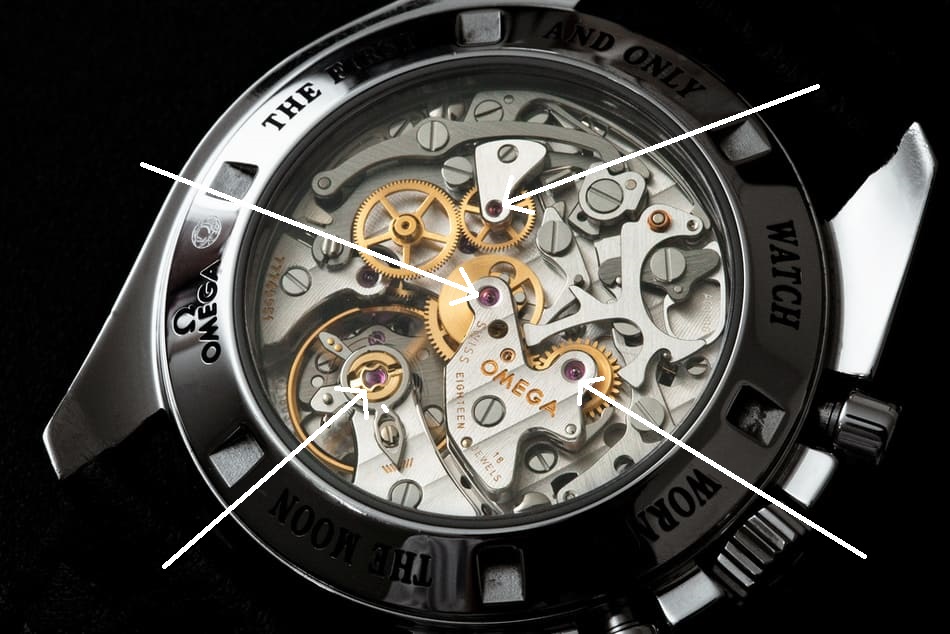 Синтетические рубины (иногда синтетические сапфиры) используются в качестве подшипников в самых тяжелых точках износа механизма часов, чтобы уменьшить трение между движущимися частями и увеличить срок службы механизма. Драгоценности имеют естественно более гладкую поверхность, чем металлические. Драгоценные камни используются только для повышения точности движения и не предназначены для украшения.