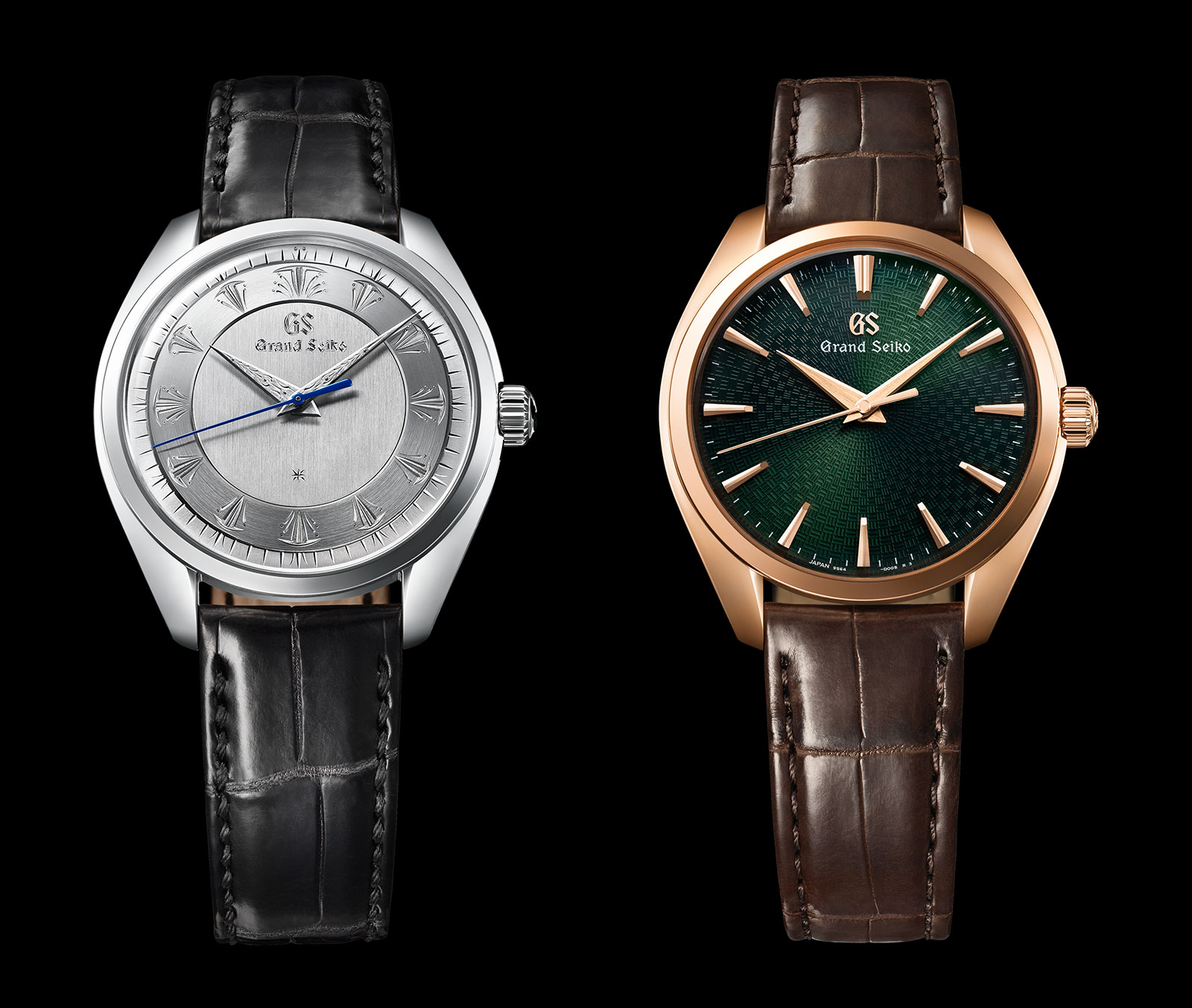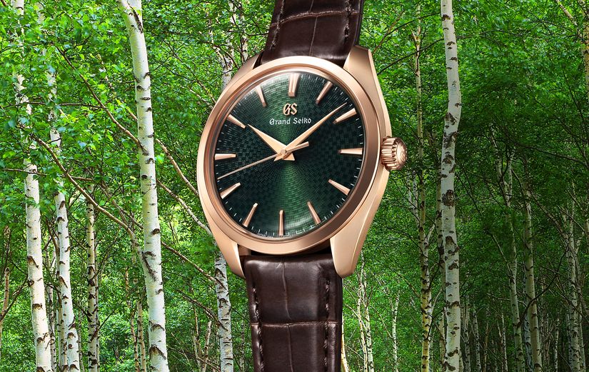Эти часы начинаются с того же 39-миллиметрового корпуса, раскладки с тремя стрелками и заводного калибра 9S64. Но на этот раз он выполнен из теплого розового золота в сочетании с блестящим зеленым циферблатом. Этот циферблат имеет тонкий переливающийся эффект, а также потрясающий геометрический рисунок, выгравированный от края до края. Как и следовало ожидать от Grand Seiko, вдохновение черпает вдохновение от природы, а мерцающий циферблат напоминает о летнем свете, струящемся сквозь белые березы в лесу возле мануфактуры Grand Seiko в Сидзукуиши.