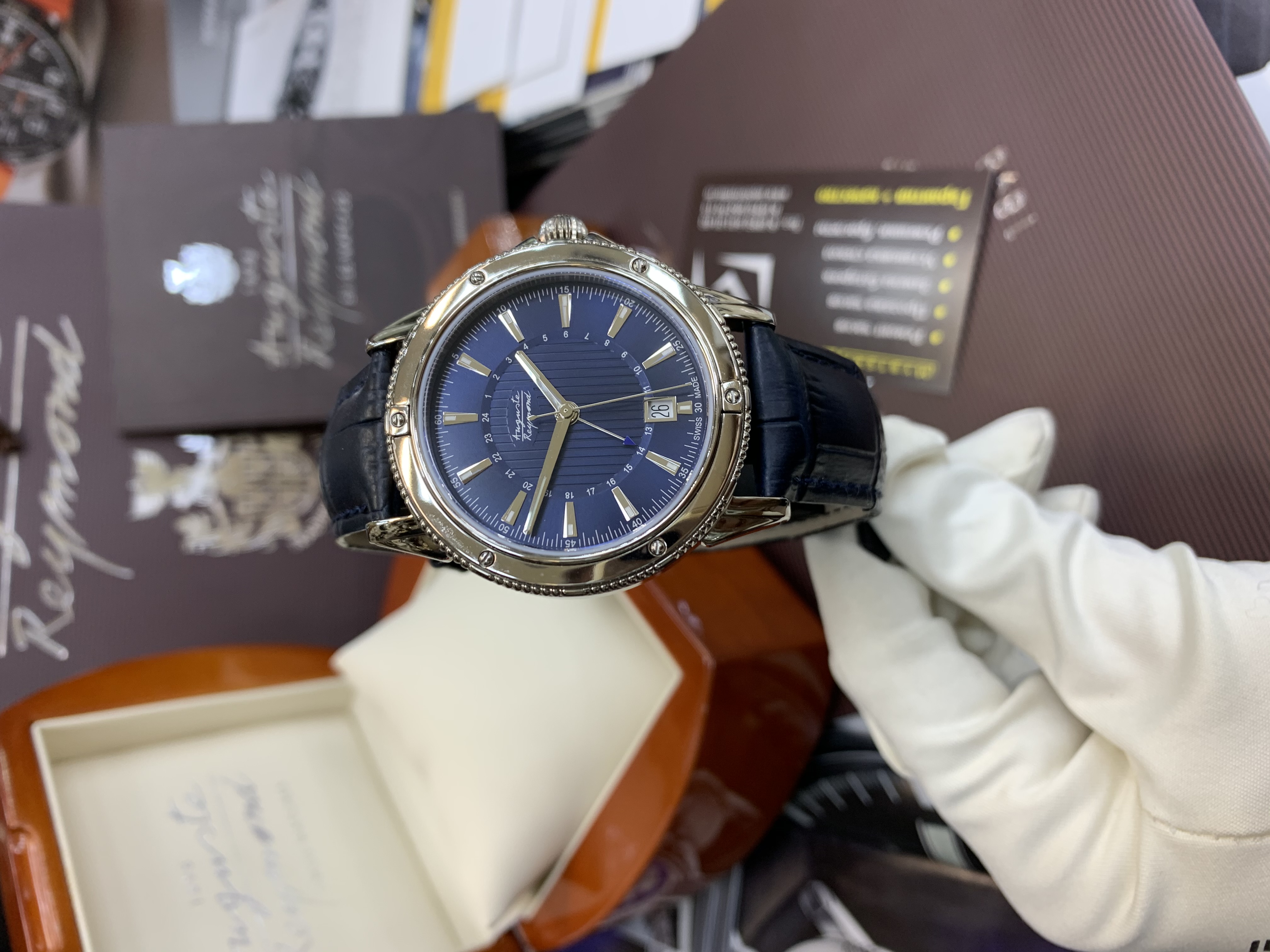 КРАТКОЕ РУКОВОДСТВО. Чтобы правильно использовать ваши часы, вам необходимо ознакомиться с инструкцией, или прочитать краткое руководство. Чтобы установить время и дату на ваших часах, вытяните заводную головку в положение 2. Поверните головку против часовой стрелки и двигайте стрелки, до тех пор, пока они пройдут через 12 часов. Если в этот момент число перевелось, продолжайте двигать стрелки, чтобы установить текущее время. Будьте внимательны при установке времени до и после полудня. Чтобы установить время после полудня, вам нужно прокрутить стрелки через 12 часов повторно. Для установки даты вытяните заводную головку в положение 1. Вращайте головку до тех пор, пока не установите нужную дату. Категорически запрещается устанавливать дату/время /месяц /фазы луны, если стрелки находятся в положении от 10 до 2 часов. Механизм может быть в процессе автоматической смены даты в этот период времени, поэтому переставляя дату вручную, вы можете повредить механизм. Ваши часы водонепроницаемы, но со временем прокладка может высохнуть. Поэтому как минимум раз в год, следует проверять водозащиту, особенно перед путешествиями. Чтобы ваши часы работали на протяжении многих лет, следует обращаться в Авторизованный Сервисный центр для проведения профилактических работ. Кожаный ремень – из натуральной кожи, нуждается в замене каждые 6-10 месяцев. В конце этого буклета находится Сервисная Книжка. Сервисный центр будет делать отметки о каждом обращении, поэтому у вас будет полная сервисная история ваших часов. На нашем сайте www.augustereymond.ch вы всегда сможете найти список авторизованных сервисных центров. Международная гарантия на ваши часы, распространяющаяся на производственные дефекты составляет 2 года. Для гарантийного ремонта потребуется заполненный оригинал гарантийной карты. Это краткое руководство – лишь основная информация. Для того чтобы, получить более подробную информацию, прочитайте интересующую вас главу в этой брошюре.