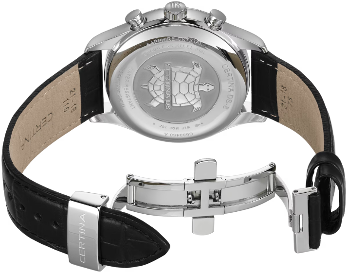 Указатель фазы Луны, одно из классических усложнений в часовом искусстве, выглядит в этой модели особенно современно и минималистично. Хронометр, сертифицированный COSC, дополнен стильными цветовыми акцентами, подчеркивающими гармоничность дизайна. Для корпуса, браслетов и застежек своих часов марка Certina использует нержавеющую сталь 316L, отличающуюся повышенной износостойкостью, устойчивостью к коррозии и гигиеничностью. В стали содержится совсем небольшое количество никеля, поэтому этот материал не вызывает аллергии при носке. Super-LumiNova (SLN) представляет собой cветящийся материал с фосфоресцирующими свойствами. В темноте SLN типа BG W9, который использует Certina, испускает свет в виде голубого мерцания. SLN не вредит здоровью и используется для нанесения на стрелки, индексы и безели. В темноте он через некоторое время теряет свои фосфоресцирующие свойства, но они автоматически восстанавливаются на свету. Сапфировое стекло состоит из порошка оксида алюминия (Al2O3), раскаленного до 2.000 C. Получаемые в результате сапфировые пласты нарезаются на тонкие пластины, им придают требуемую форму и полируют. Сапфир абсолютно прозрачен, обладает высокой устойчивостью к царапинам и механическим повреждениям. По этим причинам сапфировое стекло стало неотъемлемой деталью концепции DS и используется во всех моделях Certina для защиты циферблата. Фазы луны отображаются на вращающемся диске, который показывает фазу луны в окошке циферблата. Функцию можно отрегулировать, опираясь на данные лунного календаря. Циферблат с фазами луны - безусловно, одно из самых сложных и красивых по дизайну усложнений. Вес нетто 83 гр. Стекло сапфировое с односторонним антибликовым покрытием. Качество сапфирового стекла повышает подавление бликов с одной или с обеих сторон. Часы марки Certina имеют высококачественное двухстороннее антибликовое покрытие, обеспечивающее оптимальную прозрачность стекла. Водонепроницаемость до 10 бар (100 м). Данные о водонепроницаемости указывают на то, при каких показателях давления и глубины погружения часы продолжают правильно работать. Не рекомендуется использовать во время плавания или погружения в воду часы с водонепроницаемостью ниже 10 бар (100 м). Все часы Certina выдерживают давление минимум в 10 бар (100 м) – многие модели даже значительно больше! Длинакорпуса 41 мм. Ширина 42 мм. Толщина 11.8 мм. Между креплениями 21 мм. Кварцевый хронометр ETA G10.962 с хронографом на 12 ч, указателем фазы Луны, индикатор окончания срока службы элемента питания. Луна проходит полный цикл за 29,53 дня. Указание фазы Луны – традиционное, но вместе с тем очень непростое усложнение: Актуальная фаза Луны демонстрируется при помощи вращающегося диска на отрезке циферблата. Некоторые кварцевые часы Certina – как, например, все модели Precidrive, будь то вариант с тремя стрелками или хронограф – имеют указатель окончания срока службы элемента питания (EOL). Эта функция позволяет узнать, когда завершится срок службы элемента питания: В этом случае секундная стрелка движется с интервалами в 4 секунды, и элемент питания необходимо заменить в течение двух недель. Хронометрами имеют право называться только те часы, которые прошли сложные проверки независимой комиссии и получили сертификат точности. Организация «Contrôle officiel suisse des chronomètres», коротко «COSC», это официальная швейцарская комисси