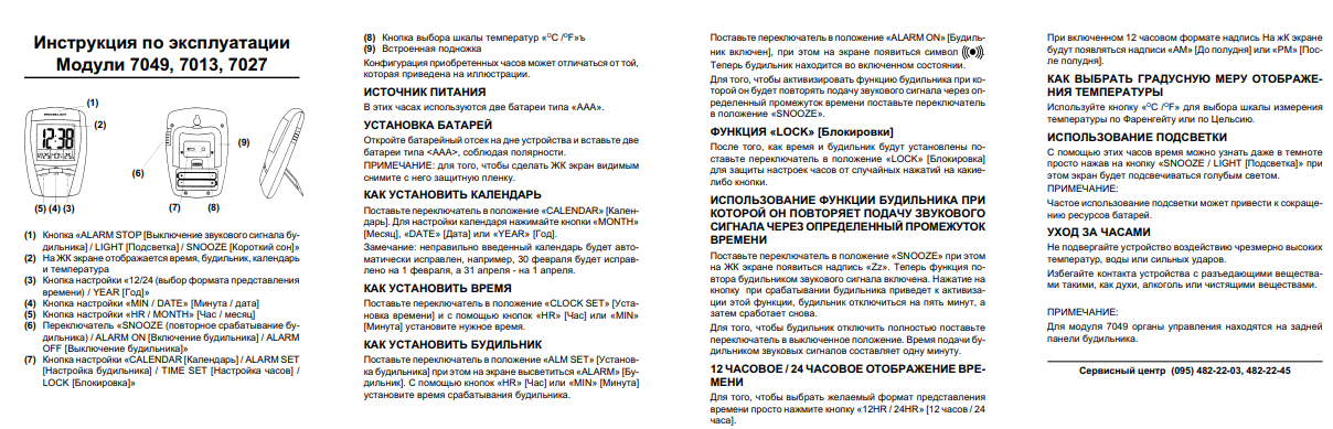 Откройте крышку батарейного отсека на задней стороне будильника и вставьте батарейку типа ”AAA” правильно соблюдая полярность. Установите крышку батарейного отсека на место. Батарейка, поставляемая вместе с будильником, является проверочной и может не обеспечить нормальную работу будильника. Установка календаря: Переведите переключатель в положение Calendar. Кнопками Month, Date и Year установите текущую дату. Невозможная дата будет автоматически исправлена на возможную. Установка часов: Передвиньте переключатель 5 в положение Clock Set и кнопками Hr (часы), Min (минуты) установите текущее время. Установка будильника: 1. Передвиньте переключатель 5 в положение Alarm Set, на дисплее появится значок “Al”. Кнопками Hr (часы), Min (минуты) установите время сигнала. 2. Передвиньте переключатель 6 в положение Alarm On. На дисплее появится значок сигнала. При этом будильник перейдет в состояние готовности. 3. Чтобы активизировать функцию Snooze переведите переключатель 6 в положение Snooze Alarm. Функция Lock. После установки часов и будильника передвиньте переключатель 5 в положение Lock для того чтобы сохранить установки в памяти будильника и помешать случайной переустановке. Использование функции Snooze. 1. Передвиньте переключатель 6 в положение Snooze. При этом на дисплее появится надпись Zz и функция Snooze будет активизирована. 2. Если будильник прозвонит Вы можете выключить сигнал нажав на клавишу Alarm stop/Light (2). Через 5 минут ваш будильник прозвенит вновь автоматически. 3. Чтобы полностью выключить сигнал переведите переключатель 6 в положение Alarm Off. 12/24 часовой режимы. 1. Переключателем 12Hr/24Hr (7) Вы сможете выбрать 12 часовой или 24 часовой формат отображения времени. 2. Значок Pm появляется, чтобы указать на вторую половину дня в 12 часовом режиме. Выбор шкалы измерения температуры. Нажмите кнопку C/F для выбора температурной шкалы. Использования люминесцветной подсветки. Если Вы хотите посмотреть время в темном помещении, просто нажмите на клавишу Alarm stop/Light (2) один раз. Дисплей будет освещен на несколько секунд. Частое использование этой функции уменьшает время жизни вашей батарейки. Избегайте воздействия на ваш будильник высоких температур, воды или ударов. Избегайте попадания на Ваш будильник активных химических (в частности спиртосодержащих) веществ.